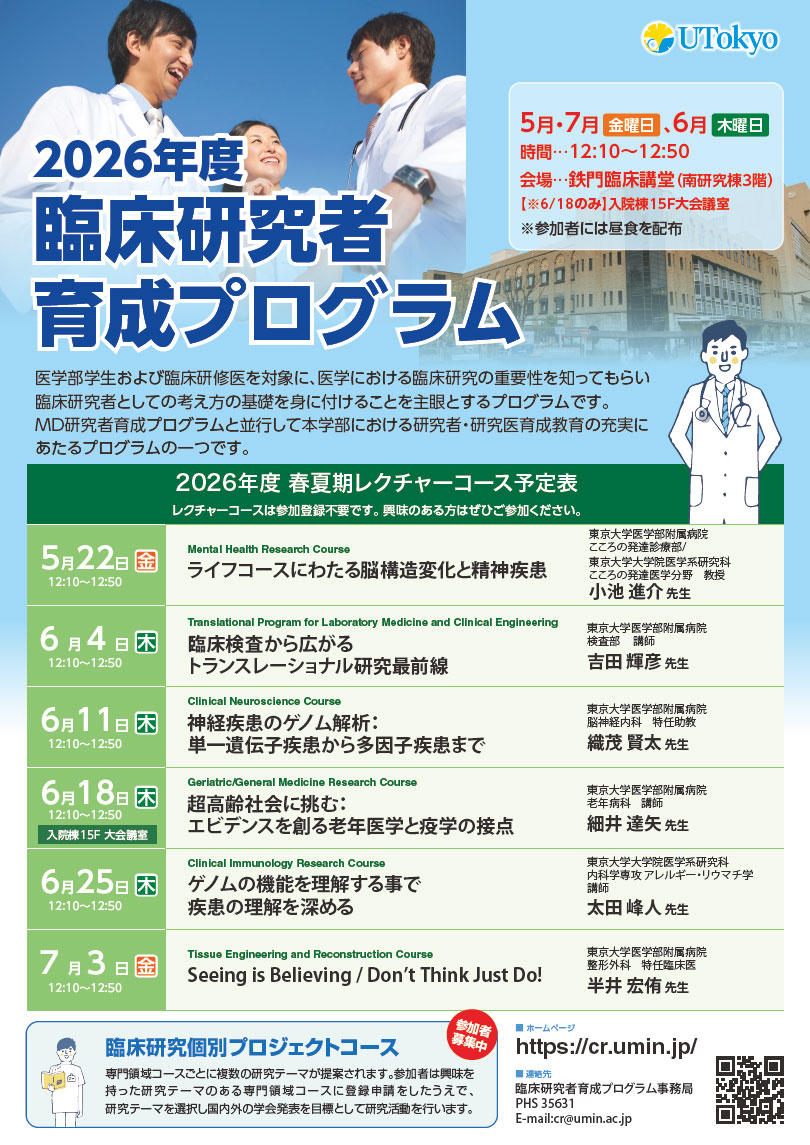 臨床研究個別プロジェクトコースガイダンス 会場:鉄門臨床講堂 南研究棟3階 全コースを二日に分けて紹介します Clinical Immunology Research Course Clinical Neuroscience Course Critical Care Nephrology Course Geriatric/General Medicine Research Course Mental Health Research Course Metabolism Research Course Oncology Research Course Surgery Research Course Tissue Engineering and Reconstruction Course Translational Program for Laboratory Medicine and Clinical Engineering 新設 |